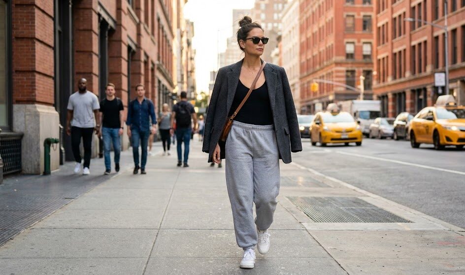 Jak to ograć? Wybierz szare lub beżowe spodnie dresowe i zestaw je z gładkim, białym t-shirtem. Na to narzuć marynarkę oversize (najlepiej w męskim stylu) z mocno zaznaczonymi ramionami. Dodanie do dresów strukturalnej marynarki i skórzanej torebki natychmiast „podnosi” rangę stylizacji, czyniąc ją odpowiednią na lunch czy luźne spotkanie biznesowe.