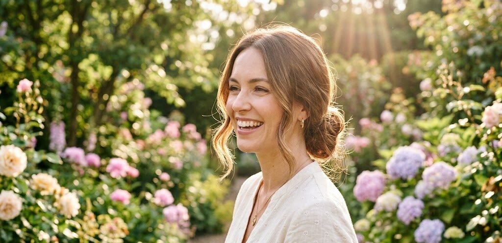 Elegancka kobieta uśmiechająca się w promieniach wiosennego słońca.