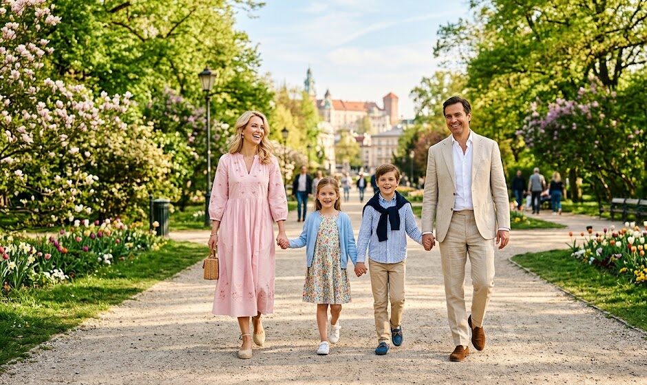 Bardzo modnym trendem wśród rodzin w 2026 roku jest tzw. „color-coordinating”, czyli dobieranie ubrań tak, by do siebie pasowały, bez zakładania identycznych rzeczy. Jeśli mama wybiera sukienkę w kolorze pudrowego różu, tata może włożyć do swojej granatowej marynarki poszetkę w podobnym odcieniu lub pastelową koszulę. Dzięki temu na wspólnych, pamiątkowych zdjęciach pod kościołem czy przy ściance, cała rodzina wygląda na zgraną i przemyślaną pod kątem wizerunkowym.